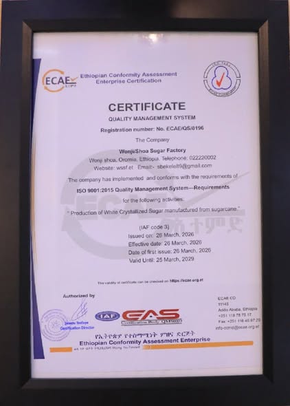 የወንጂ/ሸዋ ስኳር ፋብሪካ የዓለም አቀፍ የጥራት ማኔጅመንት ስርዓት QMS ISO-9001:2015 የምስክር ወረቀት ማግኘቱን ተከትሎ፣ በፋብሪካው ግቢ ውስጥ ደማቅ የዕውቅና እና የምስጋና መርሃ ግብር ተካሄደ። በፕሮግራሙ ላይ የማኔጅመንት አባላት፣ ሰራተኞች እና የመሰረታዊ ሰራተኛ ማህበር ተወካዮች በተገኙበት ይህ ታሪካዊ የምስራች በይፋ ተበስሯል።